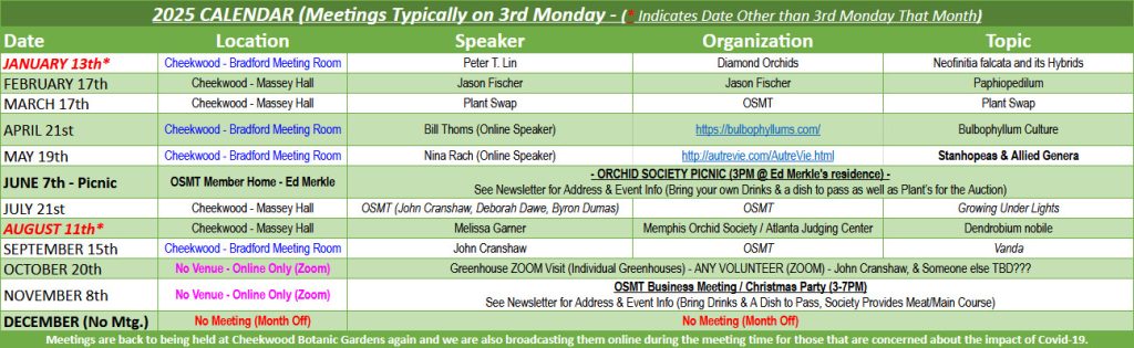 - September 15th – Cheekwood/Bradford Meeting Room – “Growing Vanda’s in Your Home” – John Cranshaw – Vanda’s for Active Members to take home (In Person @ Cheekwood)