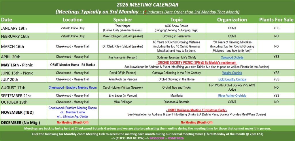 We appreciate you letting friends who may be interested know about the Orchid Society! Meetings are usually held on the third Monday of every month at Cheekwood 1200 Forrest Park Drive Nashville 37205; except for May (Annual Picnic) and November (Business Meeting & Christmas Party) and December (Month Off). Refreshments are at 6:30 pm and our meetings begin at 7 pm. As scheduling conflicts do arise for meeting times & dates, please check back here from time to time, as our meetings may be held solely online.